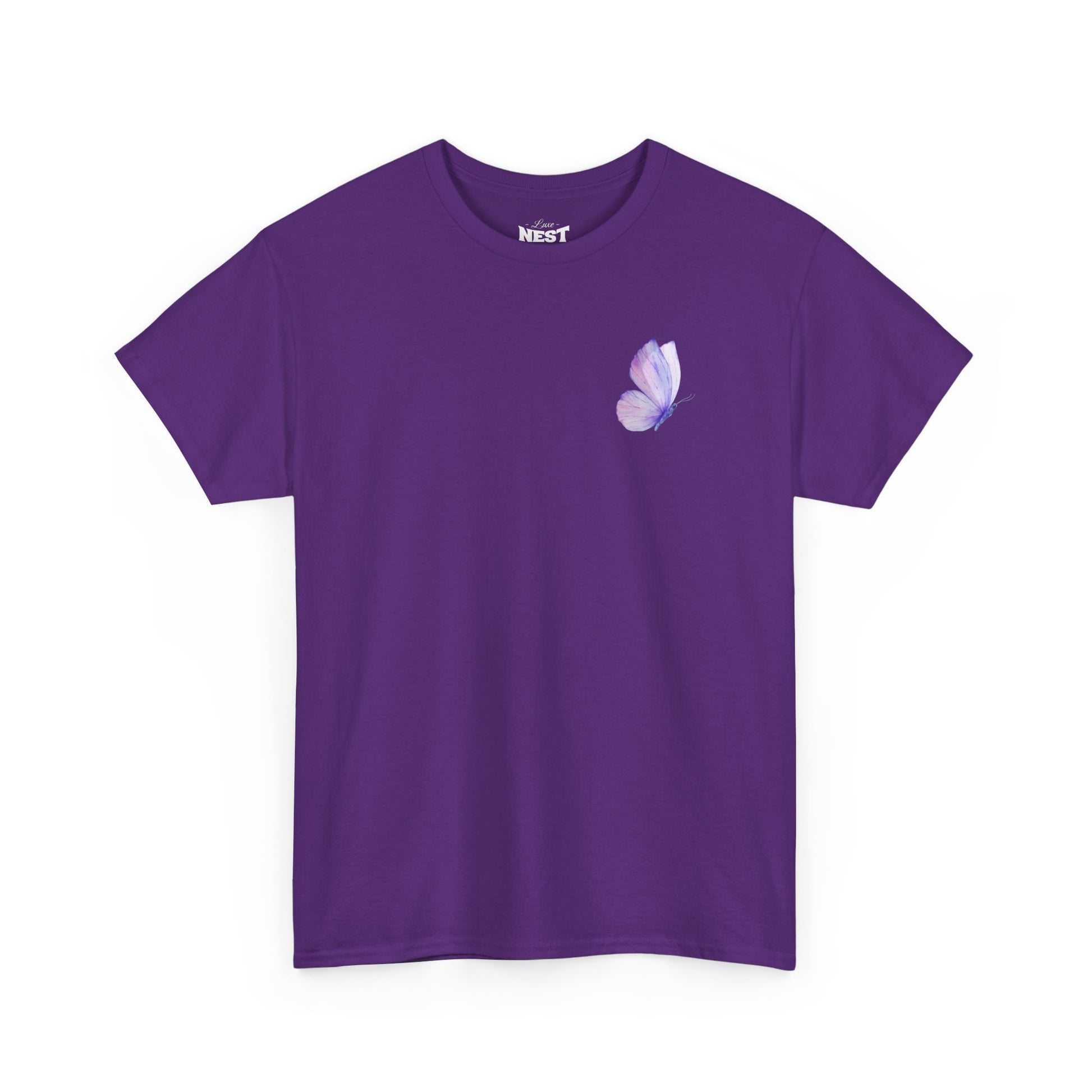 A soft, breathable tee printed with a delicate watercolor butterfly and an uplifting message—made to feel like a quiet, wearable reminder to move through the day as yourself. The slim, pastel butterfly sits over the heart on the front; a larger, watercolor wing and the phrase “Be yourself” with a small script line sit on the back. It’s light enough for layering under a jacket, or worn alone as a subtle statement piece that reads calm, thoughtful, and quietly confident.