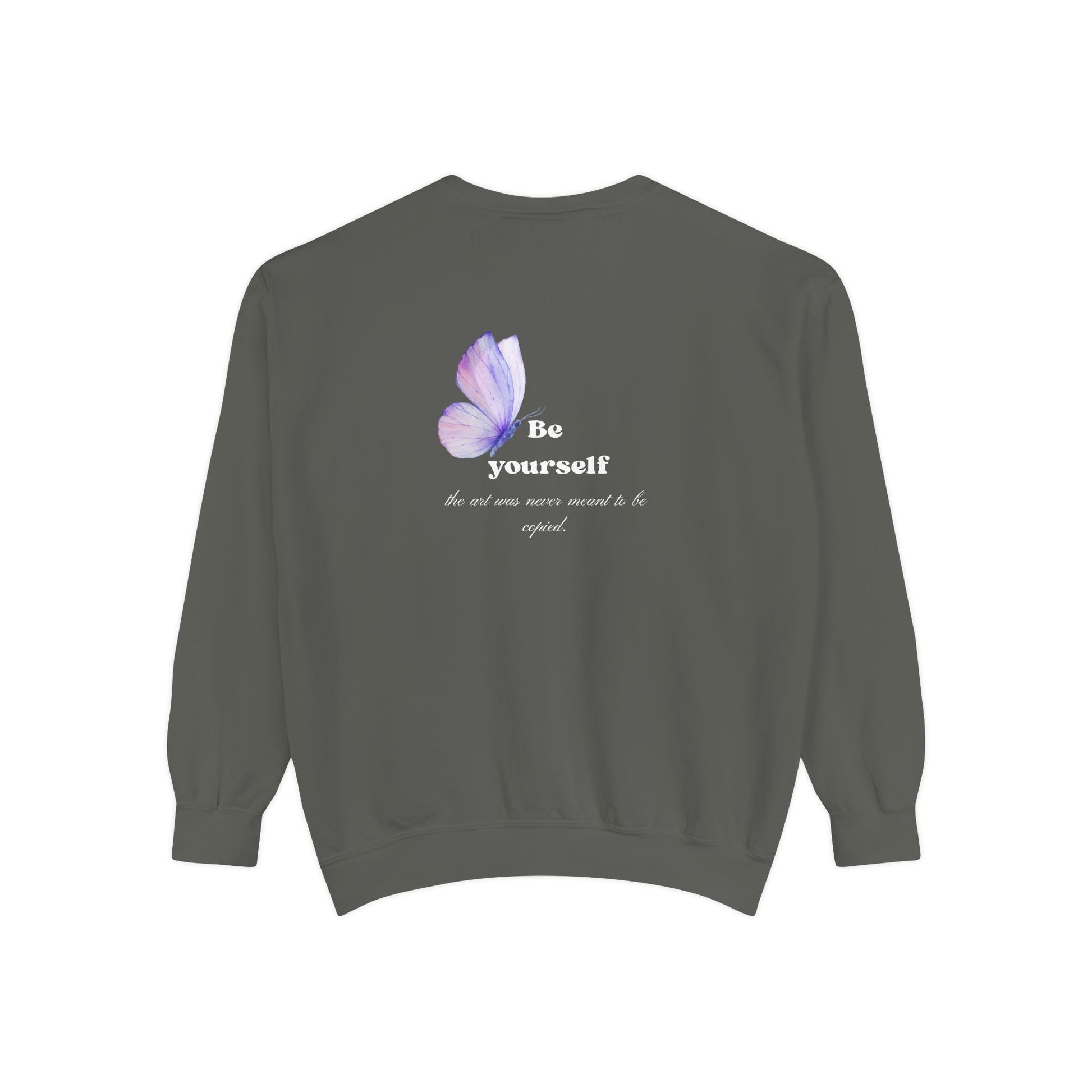 Soft, slightly oversized sweatshirt with a gentle, hand-dyed look and a small, delicate butterfly motif. The muted charcoal-green fabric feels substantial and cozy—a medium-heavy weight that holds shape while draping comfortably. A watercolor-style lilac butterfly graces the left chest, while the back carries a larger matching wing and a quiet, hopeful line of text: “Be yourself.” It’s the kind of layer you reach for on slow mornings, long walks at dusk, and evenings curled with a book. Breathable ring-spun cotton with a touch of polyester gives the piece a lived-in softness that ages beautifully. Thoughtful details like a half-moon back neck patch, ribbed collar and cuffs, and OEKO-TEX low-impact dyes make this sweatshirt feel considered and easy to wear.