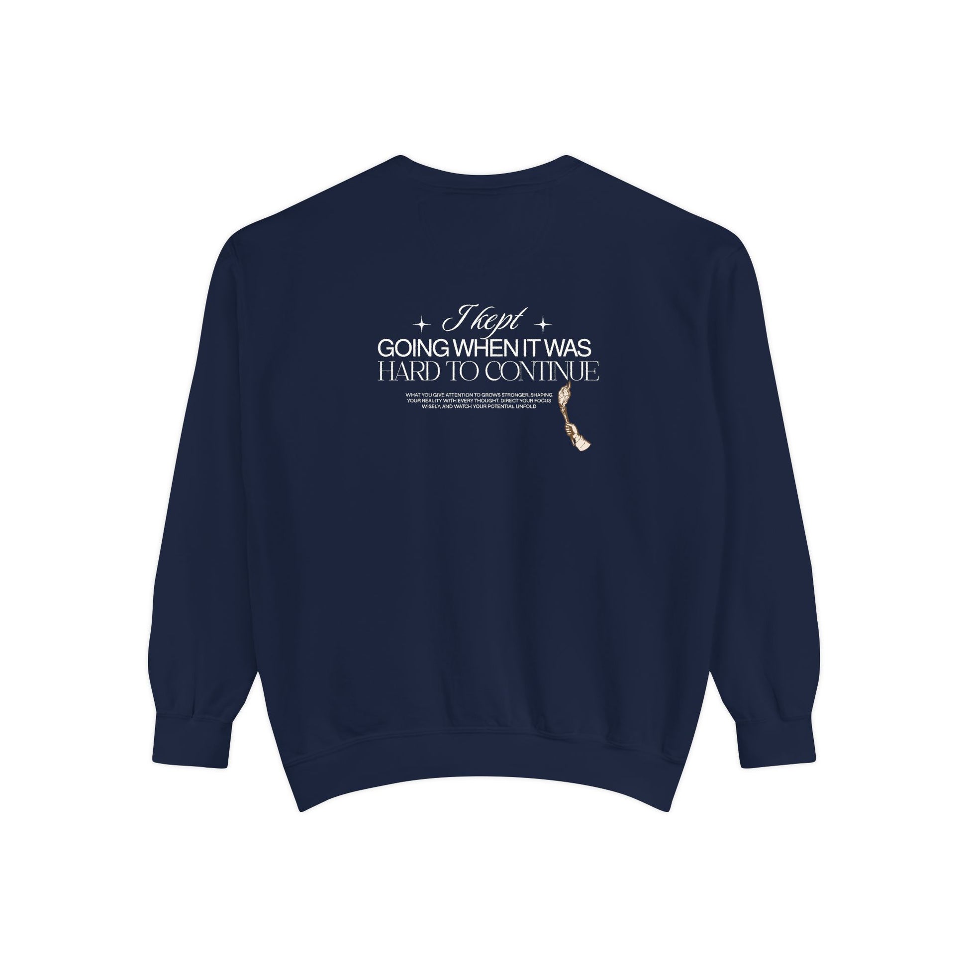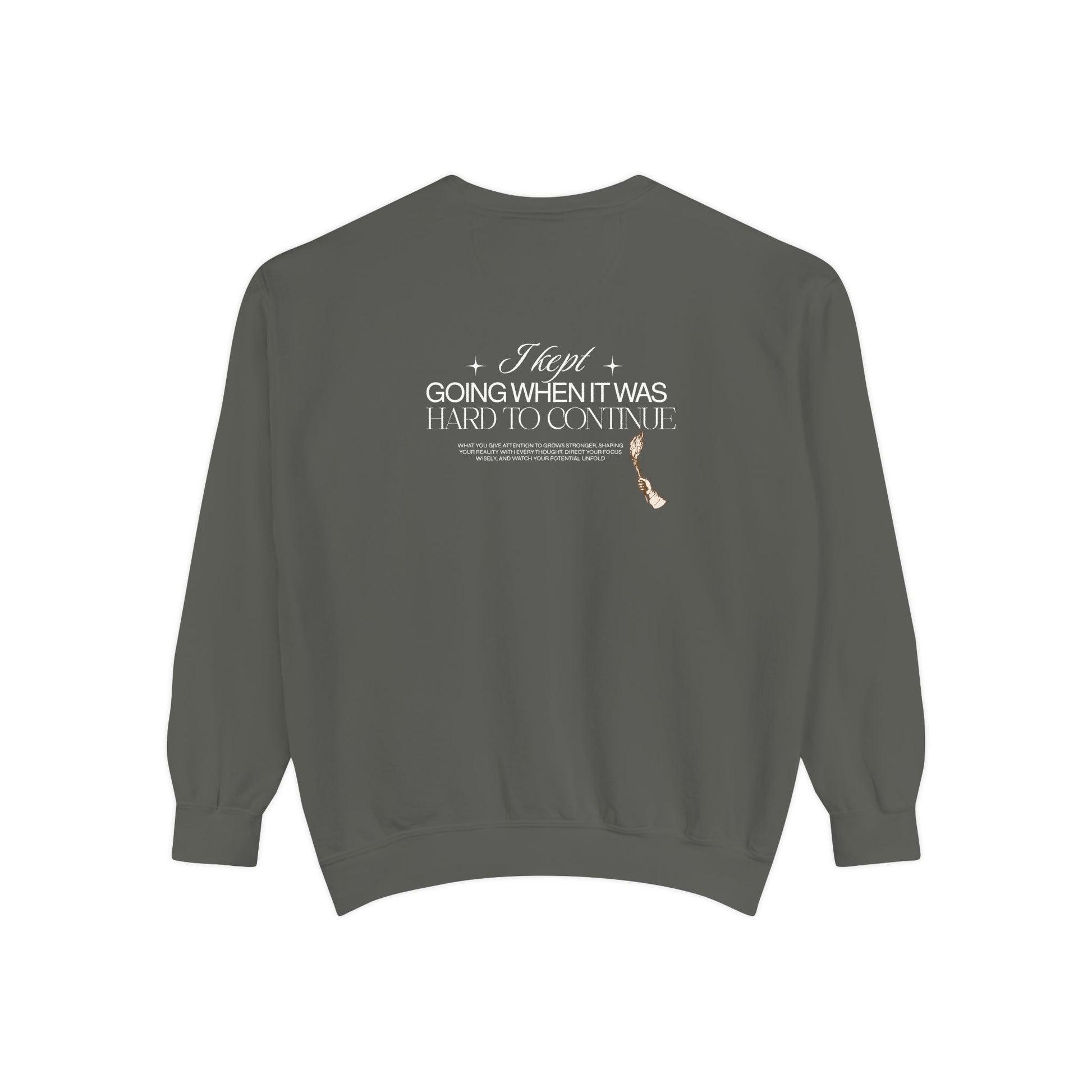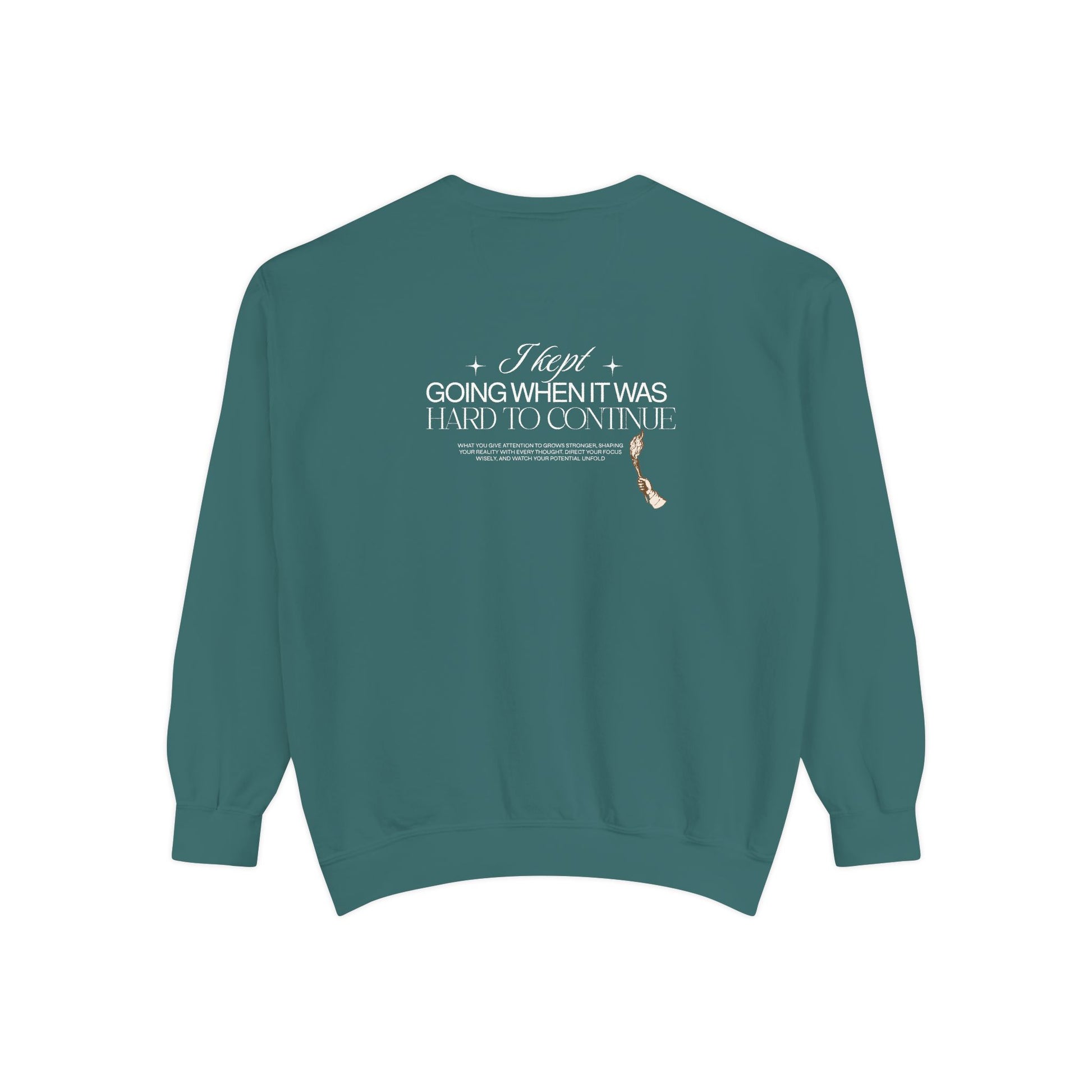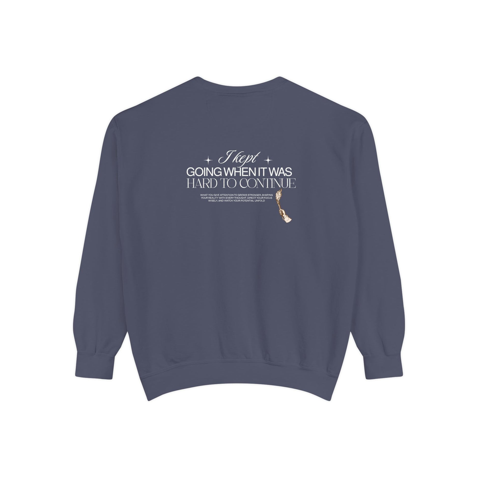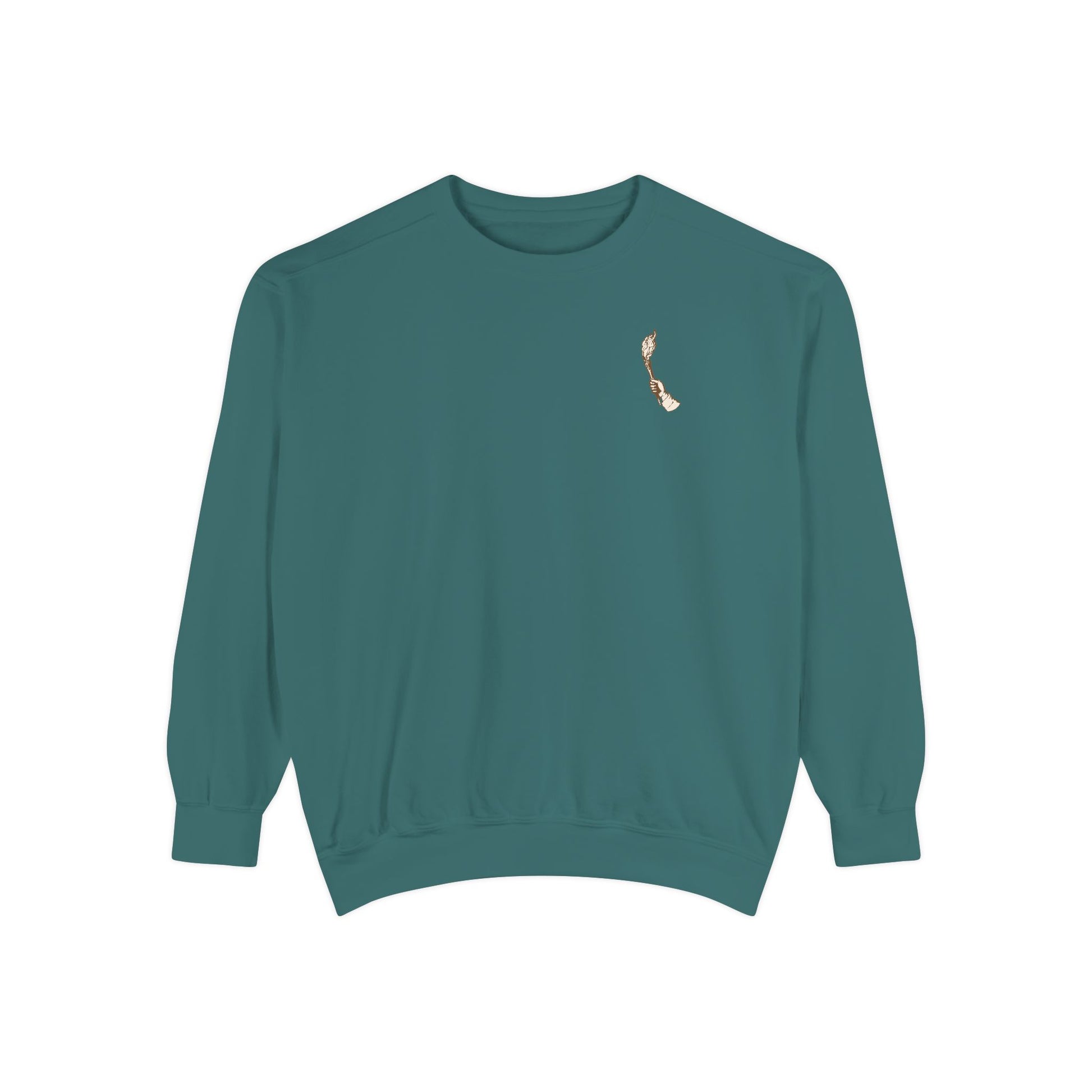 This relaxed garment-dyed sweatshirt feels like an evening walk that slows your breath. The muted, earthy color and small embroidered motif on the chest give it a quiet, thoughtful presence, while the larger back design delivers a subtle message without shouting. It drapes softly thanks to ring-spun cotton and a medium-heavy weight, so it layers easily over tees or under a jacket on cooler days. The ribbed collar, cuffs, and hem hold their shape, and twill neck tape keeps the neckline comfortable after repeated wear. Wear it when you need something warm that still reads literary and low-key — a companion for late-night writing sessions, slow coffee mornings, or casual meetups with friends who appreciate craft and calm.