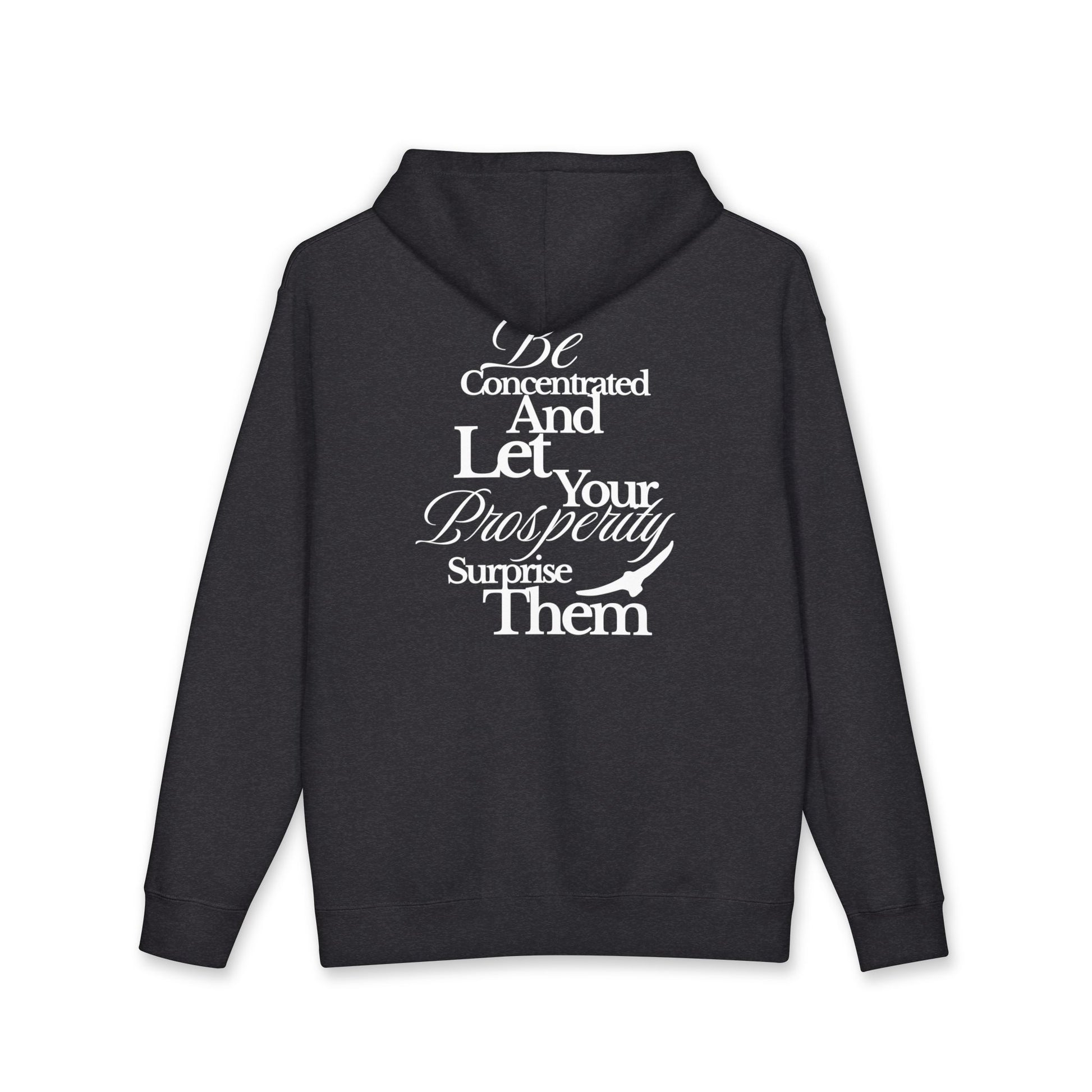 This heavyweight hooded sweatshirt feels like a quiet promise of comfort and quiet confidence. Soft, dense fabric and a fleece-lined hood wrap you in warmth while a minimalist soaring bird on the chest and a typographic message across the back — “Be Concentrated And Let Your Prosperity Surprise Them” — make a subtle, intentional statement. The relaxed, roomy cut lets you layer without bulk. Wear it on early mornings for a walk by the water, at late-night study sessions, or when you want something that looks simple but speaks to focus and steady ambition. The design reads like a personal reminder: move with purpose, stay calm, and let results do the talking.