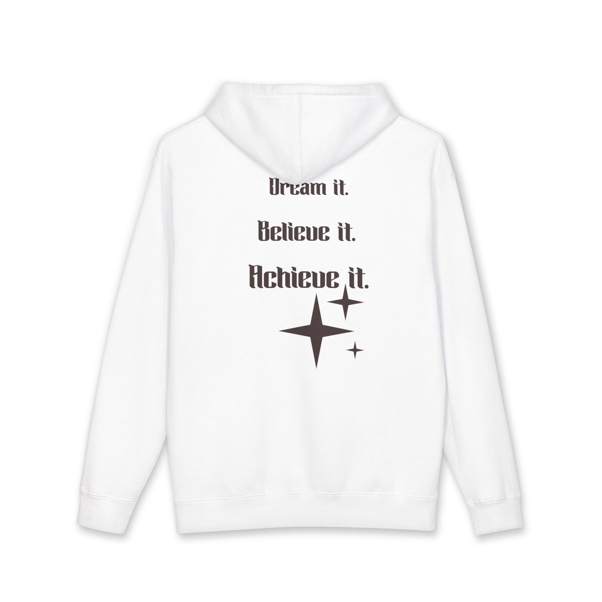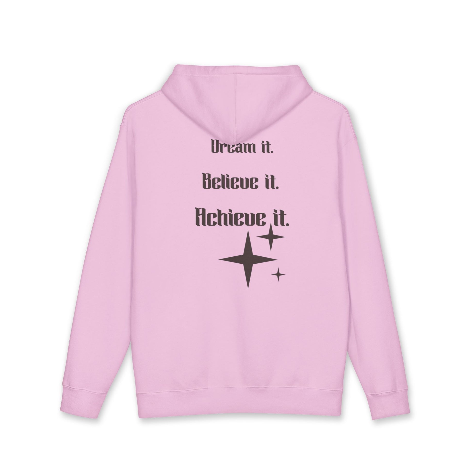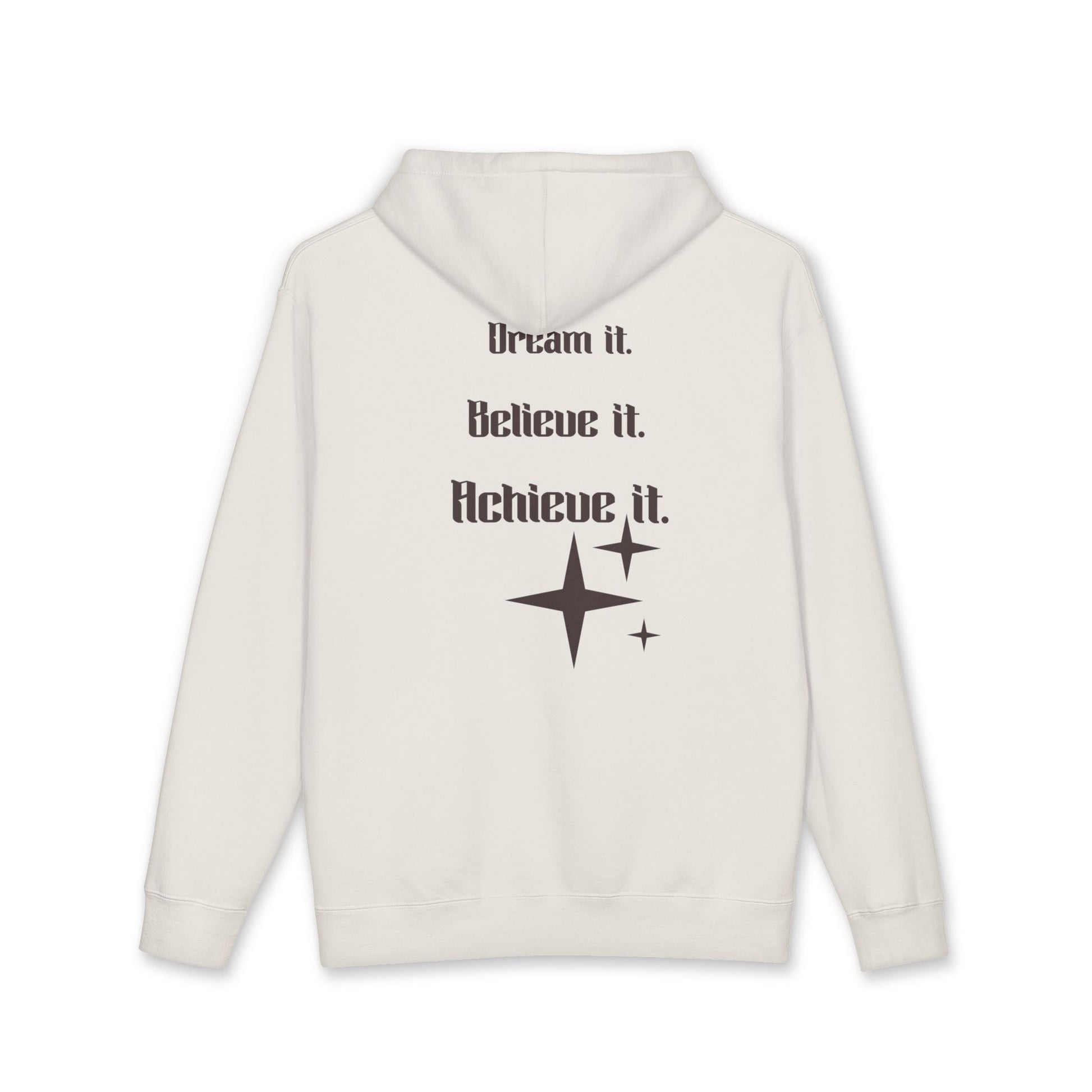 This heavyweight hooded sweatshirt wraps you in quiet confidence. The back features a minimalist typographic mantra — “Dream it. Believe it. Achieve it.” — paired with simple star icons that feel like a small, steady compass. The plush fleece-lined hood and substantial 10 oz fabric give weight and warmth without stiffness. Ribbed cuffs and waistband hold the silhouette close while a relaxed cut lets you layer a tee or flannel underneath. Wear it on cool morning walks, late-night study sessions, or as a steady reminder during goal-setting days — it’s the kind of hoodie that settles into your routine and keeps showing up.