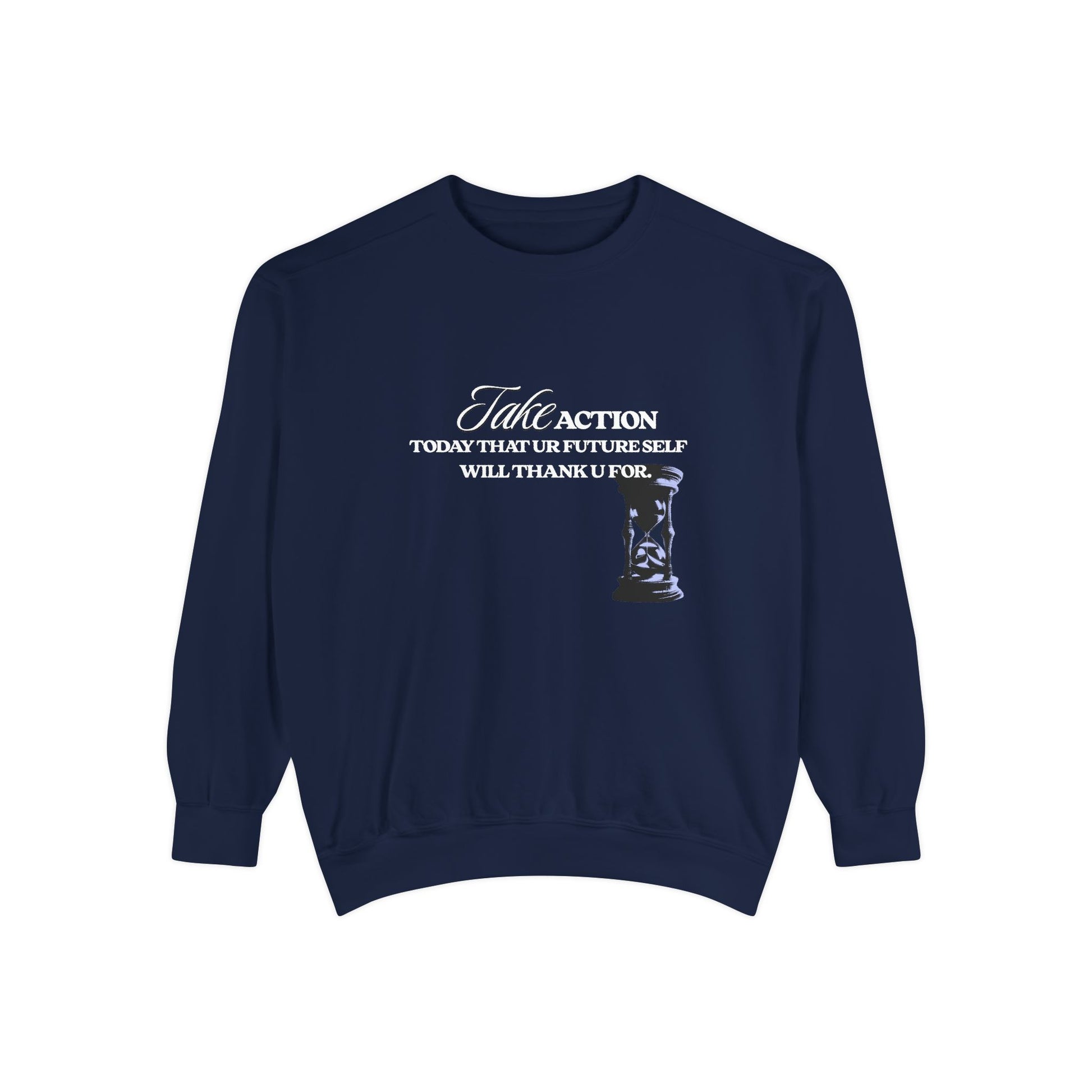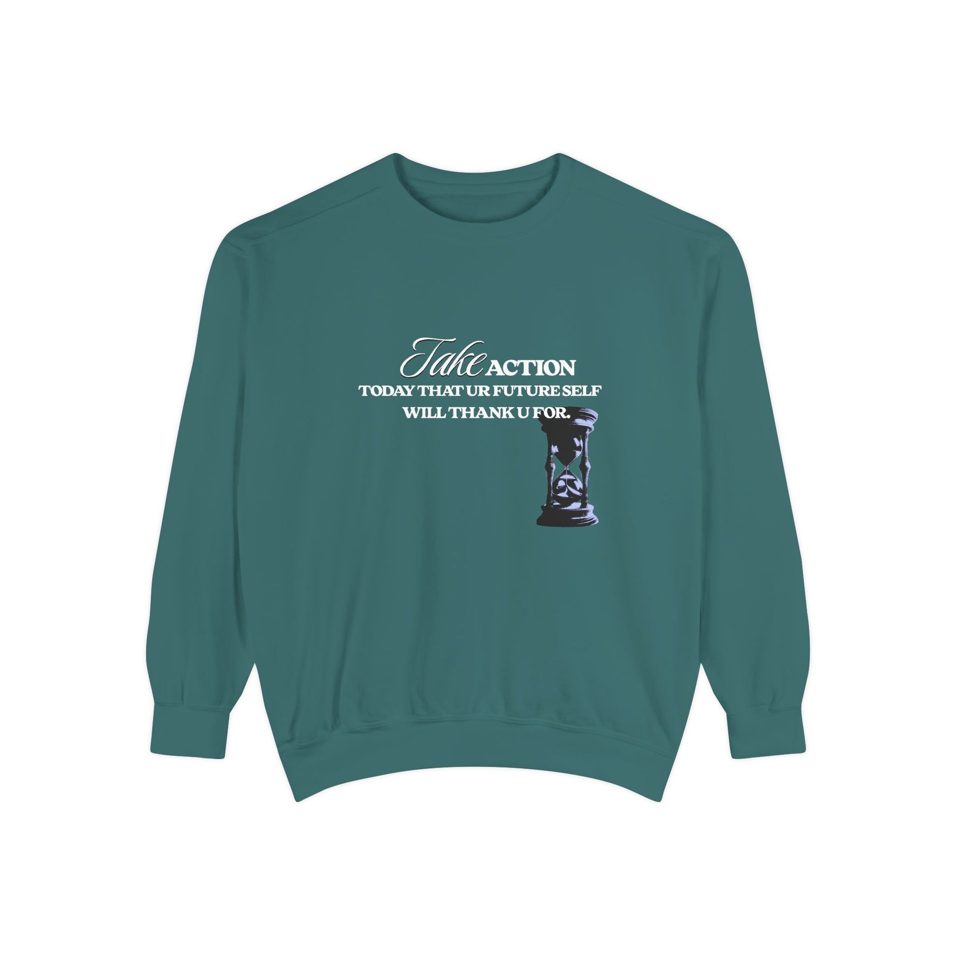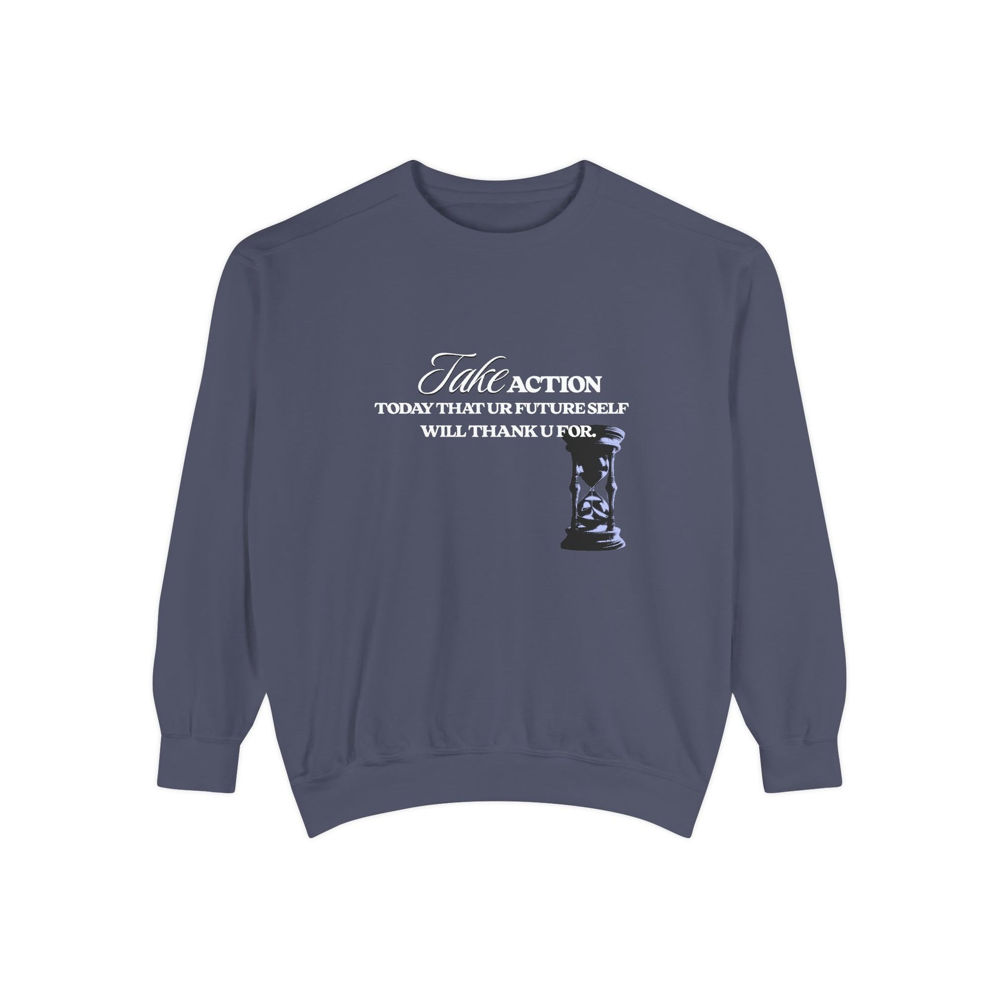 A lived-in, garment-dyed sweatshirt that reads like a quiet nudge to keep moving forward. The muted, worn-in color and relaxed silhouette make it an easy layer for mornings with coffee runs, late-night study sessions, or slow weekend walks. Subtle white lettering and a small graphic sit on the chest, while a larger, reflective-style line of text spans the back — words that feel personal and motivating rather than loud. The midweight fabric holds shape but drapes softly, and ribbed cuffs and hem bring the piece together with a cozy, familiar fit. Built with OEKO-TEX low-impact dyes and reinforced neck tape, this sweatshirt is made for everyday wear and for the people who prefer intention over noise.